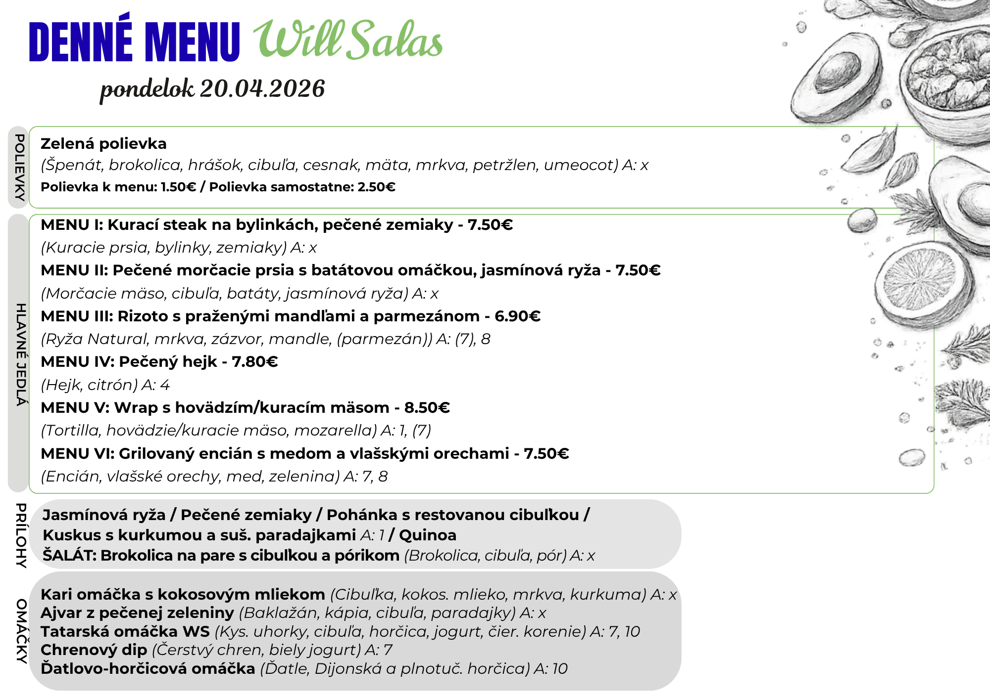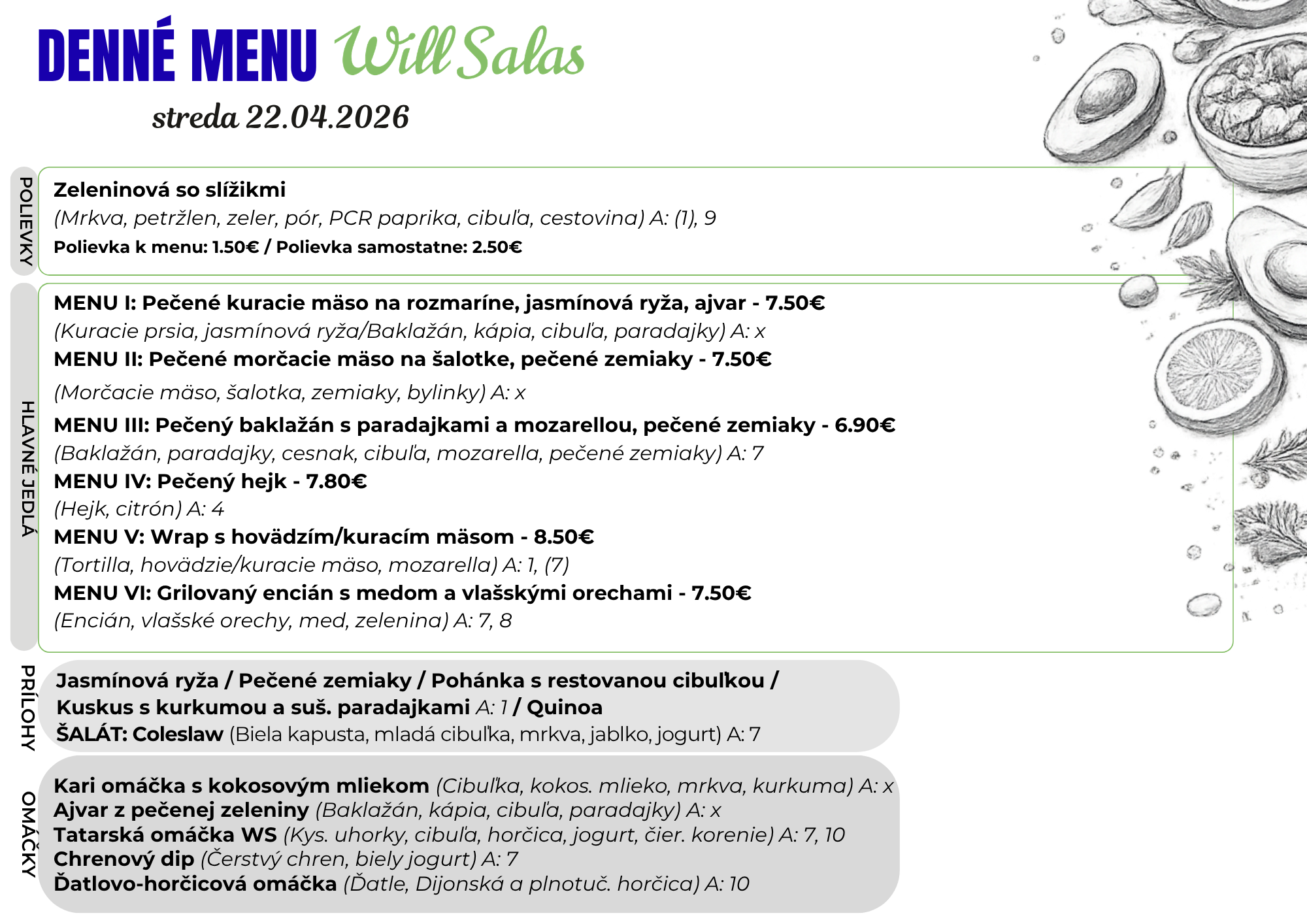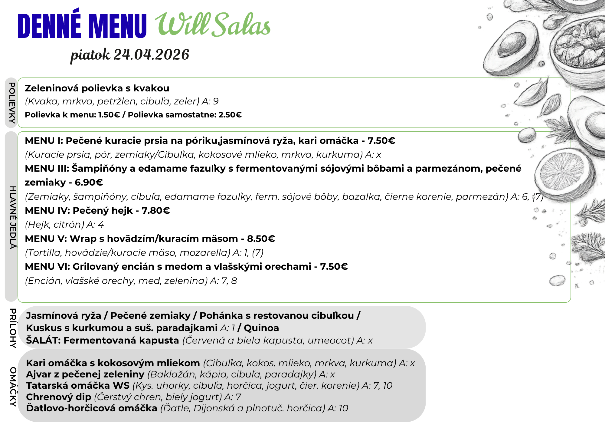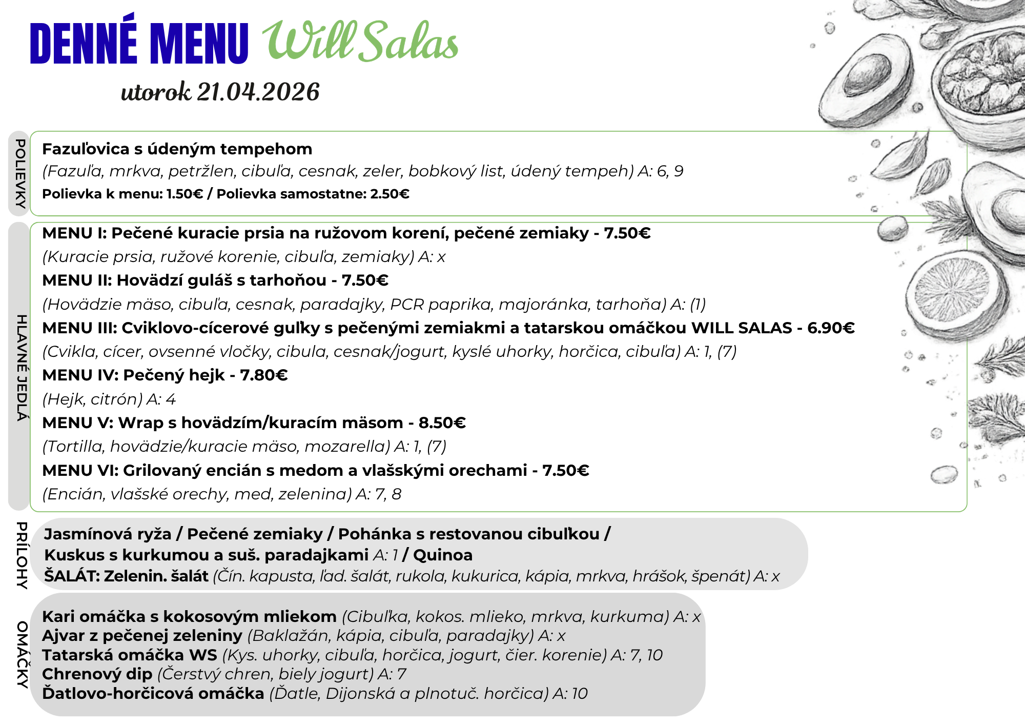 MENU I: 7,50€ | MENU II: 7,50€ | MENU III: 6,90€ | MENU IV: 7,80€ | MENU V: 8,50€ | MENU VI: 7,50€ | MENU VII: 8,50€ | POLIEVKA K MENU: 1,50€ | POLIEVKA SAMOSTATNE: 2,50€ | ŠALÁT K MENU: 0,90€