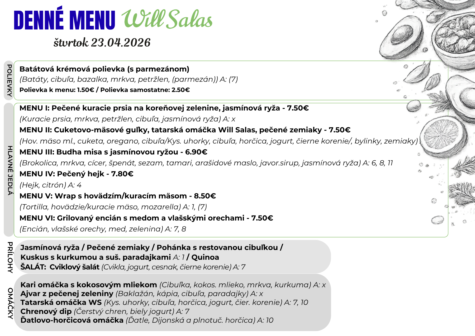 Skvele jedlo, skveli ludia, nadherne nove priestory. Zdrave, chutne jedlo varene srdcom sa vzdy odrazi ako sa po obede vo Will Salas citim…..proste skvelo! Dakujeme za vsetko co robite srdcom a pre ludi